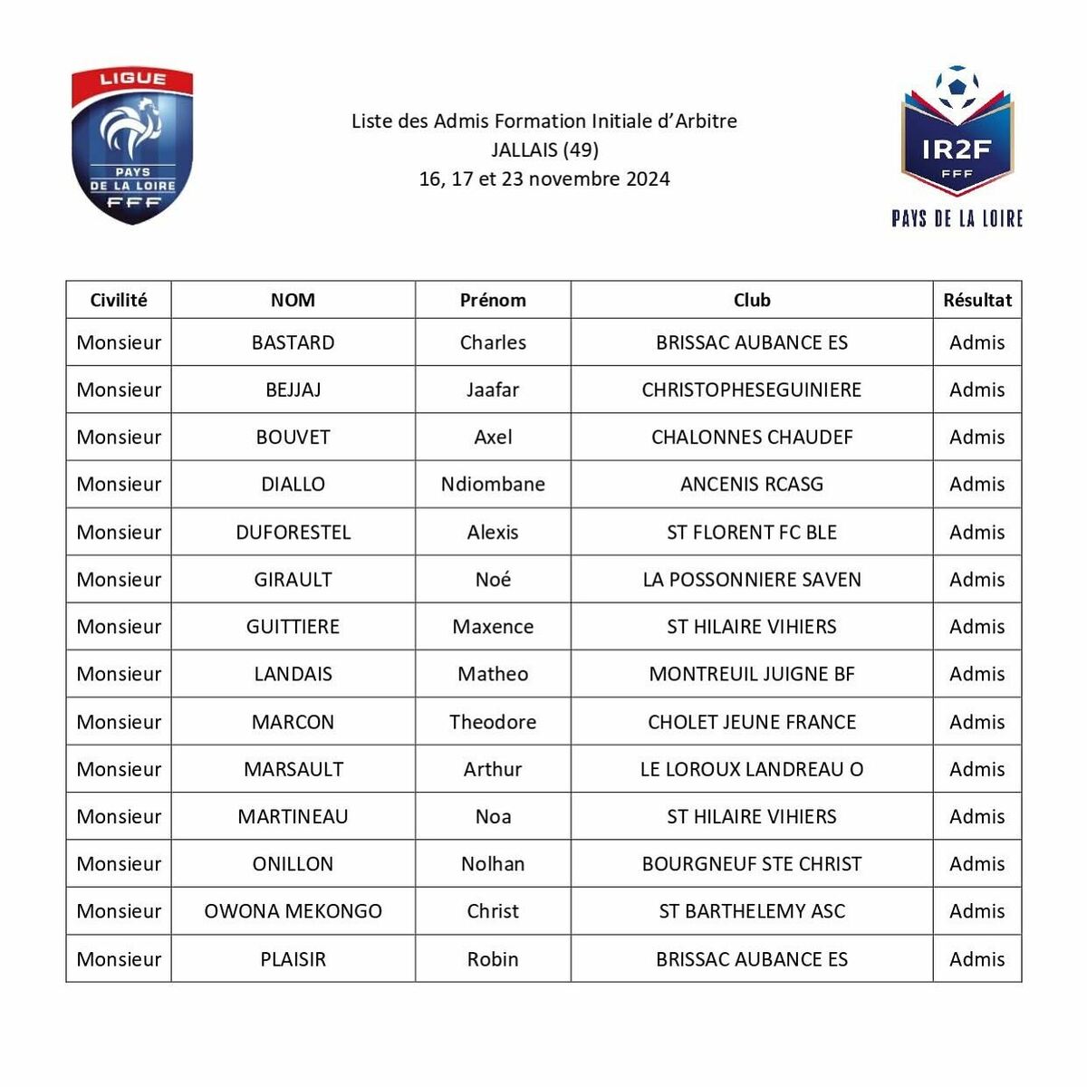 C’est avec enthousiasme que nous annonçons l’admission de Maxence et Noa à la formation initiale d’arbitre !